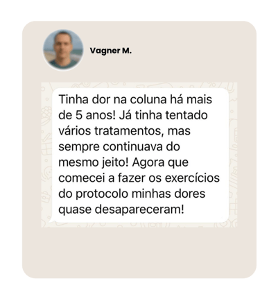 Você terá acesso a vídeo aulas rápidas e guiadas por um fisioterapeuta especialista, com exercícios terapêuticos que você faz em casa, em apenas 15 min por dia. Basta seguir o passo a passo utilizando seu celular ou computador, para reduzir a dor na coluna e destravar seus movimentos. Funciona para quem já tentou de tudo e ainda sofre com dores na coluna, com orientações seguras para qualquer nível de condicionamento.